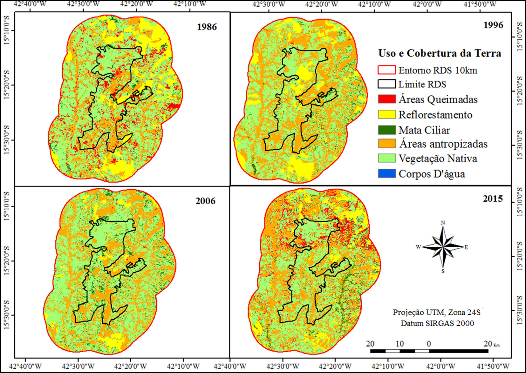 A expansão de áreas de pastagens e cultivos agrícolas foi responsável pela maior parte do desmatamento no norte do estado de Minas Gerais. No presente estudo, avaliou-se a dinâmica do uso e cobertura da terra ocorrida nas últimas décadas (1986 a 2015) na Reserva de Desenvolvimento Sustentável Nascentes das Geraizeiras (RDS-NG) e em uma zona de 10 km do seu entorno no estado de Minas Gerais. Avaliaram-se também os efeitos do desmatamento sobre a fragmentação da vegetação natural usando dados de sensoriamento remoto e análise da paisagem. Os resultados deste estudo indicam que o desmatamento afetou mais da metade da vegetação natural até 2015, agravando a integridade dos fragmentos de vegetação nativa na área de estudo. A RDS-NG contribuiu para mitigar a fragmentação da vegetação natural ocorrida no entorno daquela Reserva com a regeneração natural de algumas áreas degradadas. Observou-se que a maior ameaça ambiental à reserva é a ocorrência do fogo, que varia anualmente em extensão e danos socioambientais. O uso sustentado das terras na RDS-NG pode ser melhorado com a ampliação das práticas de atividades econômicas sustentáveis, como o aproveitamento de produtos florestais não madeireiros, a implantação de consórcios agroflorestais e outras atividades econômicas de forma moderada. Essas práticas contribuirão para garantir a manutenção dos recursos naturais, a produção econômica e a geração de renda e trabalho à comunidade local, com inclusão de todos os segmentos sociais da população da Reserva e seu entorno.