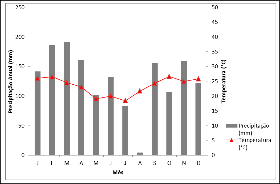 O trabalho foi conduzido no município de Rio Brilhante, Estado de Mato Grosso do Sul (21°48’ S; 44°32’ W). O solo é classificado como Latossolo Vermelho Eutrófico típico, de textura argilosa (EMBRAPA, 2013). De acordo com o sistema de classificação Köppen (Cwa), o clima é caracterizado como mesotérmico úmido, com verões quentes e invernos secos (Figura 1).