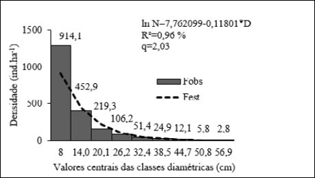A análise da distribuição diamétrica (Figura 4) representou o comportamento esperado para a comunidade com tendência à curva exponencial negativa, e o incremento diamétrico em classes foi confirmado pelo coeficiente de determinação (R² = 0,964365). Assim, pela análise foi possível identificar a capacidade autorregenerativa da comunidade arbórea, e através da menor frequência dos indivíduos com elevado DAP, isto é, há um elevado número de indivíduos jovens ocupando as primeiras classes de frequência. De acordo com o quociente de Liocourt, cujo valor foi de 2,03, a comunidade, de um modo geral, apresentou equilíbrio entre as taxas demográficas, no entanto, a fase de recrutamento de algumas espécies pode vir a ser prejudicada pelo histórico de perturbação, como já observado em outros estudos em florestas tropicais (GOMES; SOUSA; MEIRA NETO, 2004; CARVALHO; NASCIMENTO, 2009).