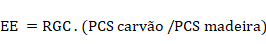Em que: RGC = rendimento gravimétrico de carvão vegetal (%); PCS carvão e PCS madeira = poder calorífico do carvão e madeira (cal.g-1); DB = densidade básica da madeira (t.m-3); DRA = densidade relativa aparente do carvão vegetal (g.cm-3).