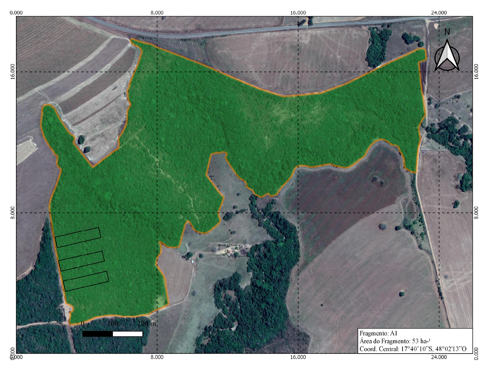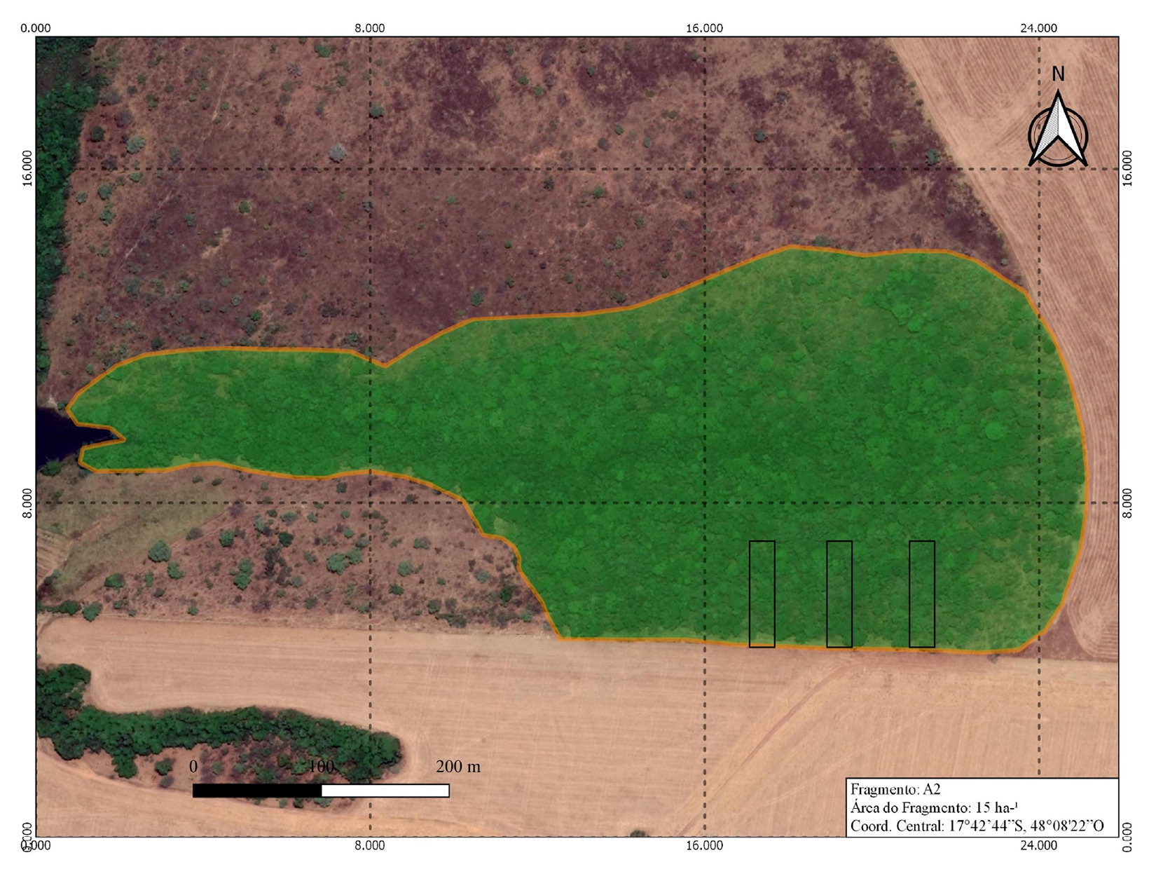 Em ambos os estudos, foram amostrados 3 transectos com 10 parcelas contíguas permanentes de 10x10 m cada, demarcadas a partir da borda florestal (Figura 1) com estacas de ferro e fita barbante, totalizando 0,3 ha amostrados por área. A distância entre cada transecto foi de, no mínimo, 50 metros, medidos a partir da linha de referência, na parte externa do fragmento.