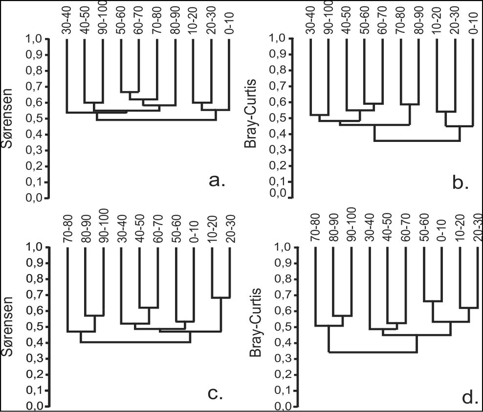 As parcelas foram unidas baseando-se em suas distâncias com relação à borda, e, em seguida, foram elaborados dois dendrogramas de similaridade, o primeiro baseado na presença/ausência das espécies em cada parcela (Coeficiente de Sørensen) e o segundo baseado no número de indivíduos por parcela (Índice de Bray & Curtis), utilizando o software PAST 3 (HAMMER, 2019).