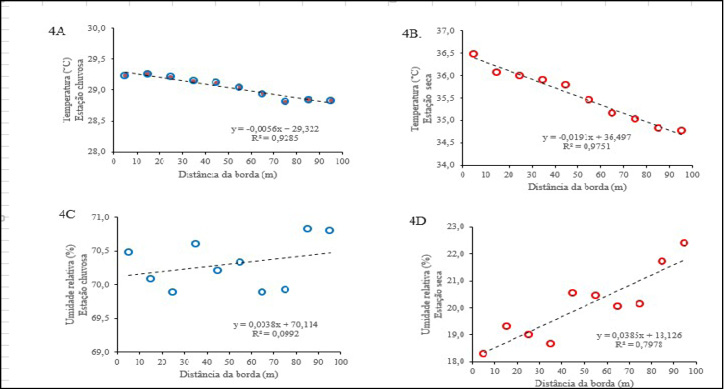 Figura 4 – Análise de regressão das variáveis medidas com a distância da borda. 4A: temperatura na estação chuva x distância da borda; 4B: temperatura na estação seca x distância da borda; 4C: umidade na estação chuvosa x distância da borda; 4D: umidade na estação seca x distância da borda