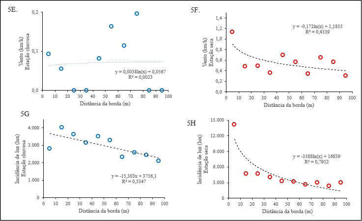 Figure 5 – Regression analysis of the variables measured with the distance from the edge. 5E: wind in the rain season x distance from the edge; 5F: wind in the dry season x distance from the edge; 5G: light intensity in the rainy season x distance from the edge; 5H: light intensity in the dry season x distance from the edge