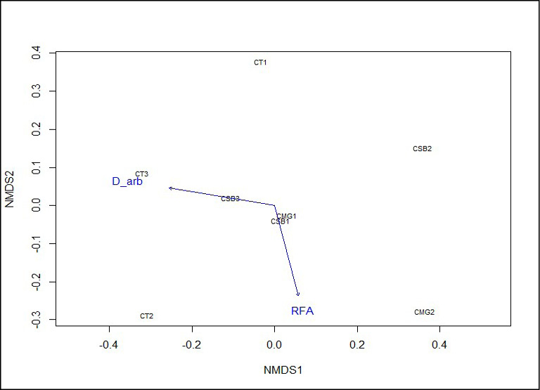 A resultado da análise NMDS foi importante em confirmar que a influência das estratégias de aumento da produção de pasto nas caívas foi menos impactante que, provavelmente, a influência do uso histórico de cada área. Isso pode ser observado pela alta similaridade apenas entre caívas próximas entre si, como a CMG1 e CSB1 (Figura 2), que pertencem à mesma propriedade rural. Esse é um resultado bastante promissor, pois a análise usou os parâmetros de produção do pasto, que foi muito diferente entre as três estratégias (HANISCH, 2018).