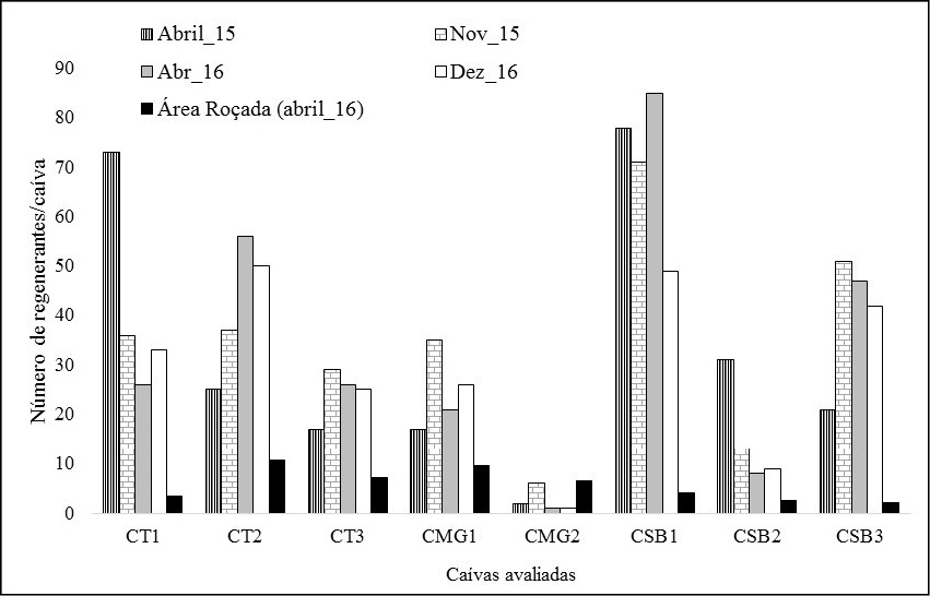 Figura 3 – Número de indivíduos regenerantes nas parcelas amostrais de cada caíva, por levantamento, e na área amostral onde ocorria a prática da roçada
