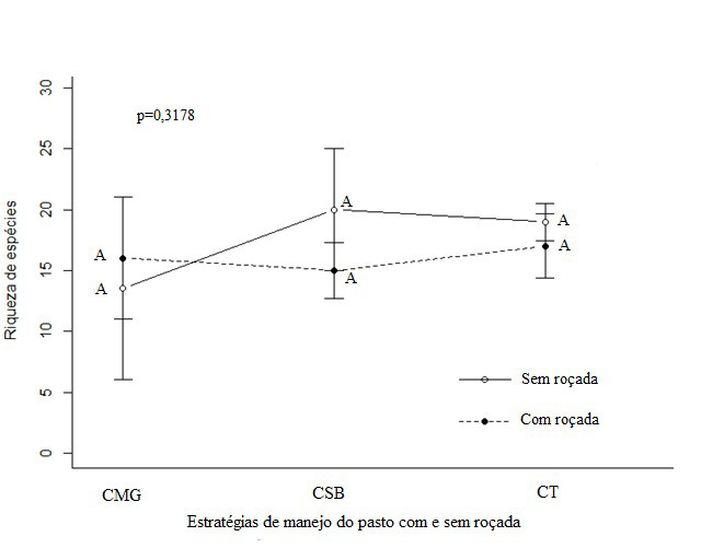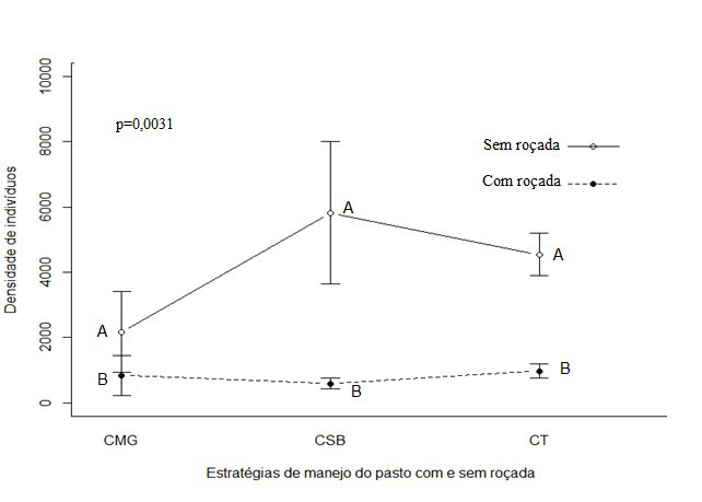 Em que: CT = tradicionais; CSB = com sobressemeadura; CMG = com missioneira-gigante. Letras iguais não diferem entre si pelo teste de Fisher a 5%, na comparação entre com e sem roçada.