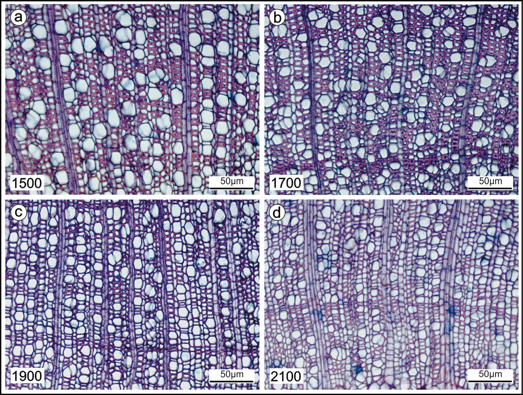As modificações significativas ocorridas na anatomia do xilema secundário dos galhos ao longo do gradiente altitudinal são mostradas na Tabela 2 e Figura 4. O comprimento dos elementos de vaso apresentou diminuição com o aumento altitudinal. Em relação ao diâmetro tangencial, os elementos de vaso apresentaram aumentos entre as duas menores cotas altitudinais (Figuras 4a-b) e reduções nas duas maiores (Figuras 4c-d). O índice de vulnerabilidade de Carlquist e de mesomorfia diminuíram ao longo do gradiente altitudinal, bem como o comprimento das fibras. A espessura das paredes das fibras aumentou significativamente conforme aumentou a altitude. A frequência de vasos/mm2 não diferiu entre as cotas altitudinais analisadas, com média de 309,17 vasos/mm2. As ocorrências dos vasos solitários reduziram com o aumento da altitude e houve aumentos dos vasos múltiplos (Figuras 4c-d).