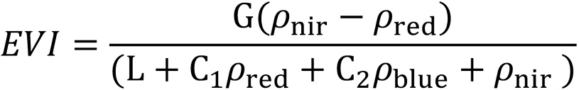 Em que: ρnir = (0,851 – 0,879 μm); ρred = (0,636 – 0,673 μm); ρblue = (0,452 – 0,512 μm); L = fator de ajuste para o solo; G = fator de ganho; C1 e C2 = coeficientes de ajuste para efeito de aerossóis na atmosfera. Os valores dos coeficientes utilizados na equação para obtenção do EVI foram: L = 1, C1 = 6, C2 = 7,5 e G = 2,5 (HUETE et al., 1997).