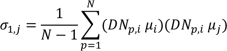 Em que: DNp,i é um número digital de um pixel p na banda i; j é um número digital de um pixel p na banda j; e são as médias do DN para as bandas i e j, respectivamente.
