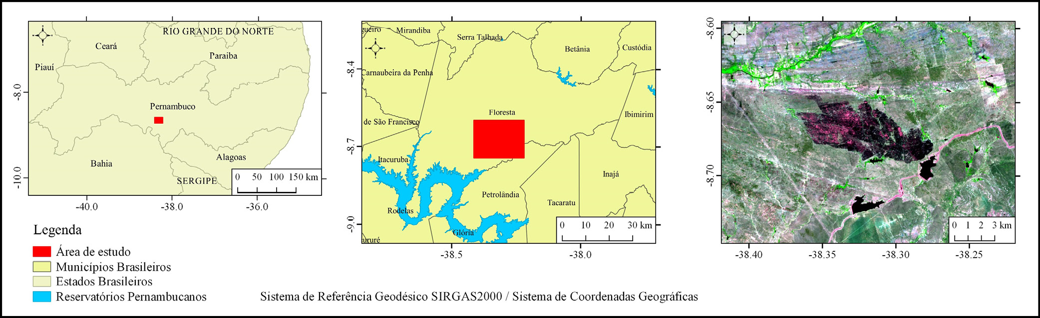A área de estudo compreende um polígono delimitado por coordenadas geográficas 8°44’40.79”S, 38°24’55.00”O e 8°35’52.22”S, 38°13’9.18”O, localizado no município de Floresta, semiárido pernambucano. O limite da área de estudo localiza-se próximo ao Reservatório de Itaparica, que integra o complexo hidroelétrico de Paulo Afonso e tem a importância de abastecer os municípios próximos e favorecer a irrigação agrícola.