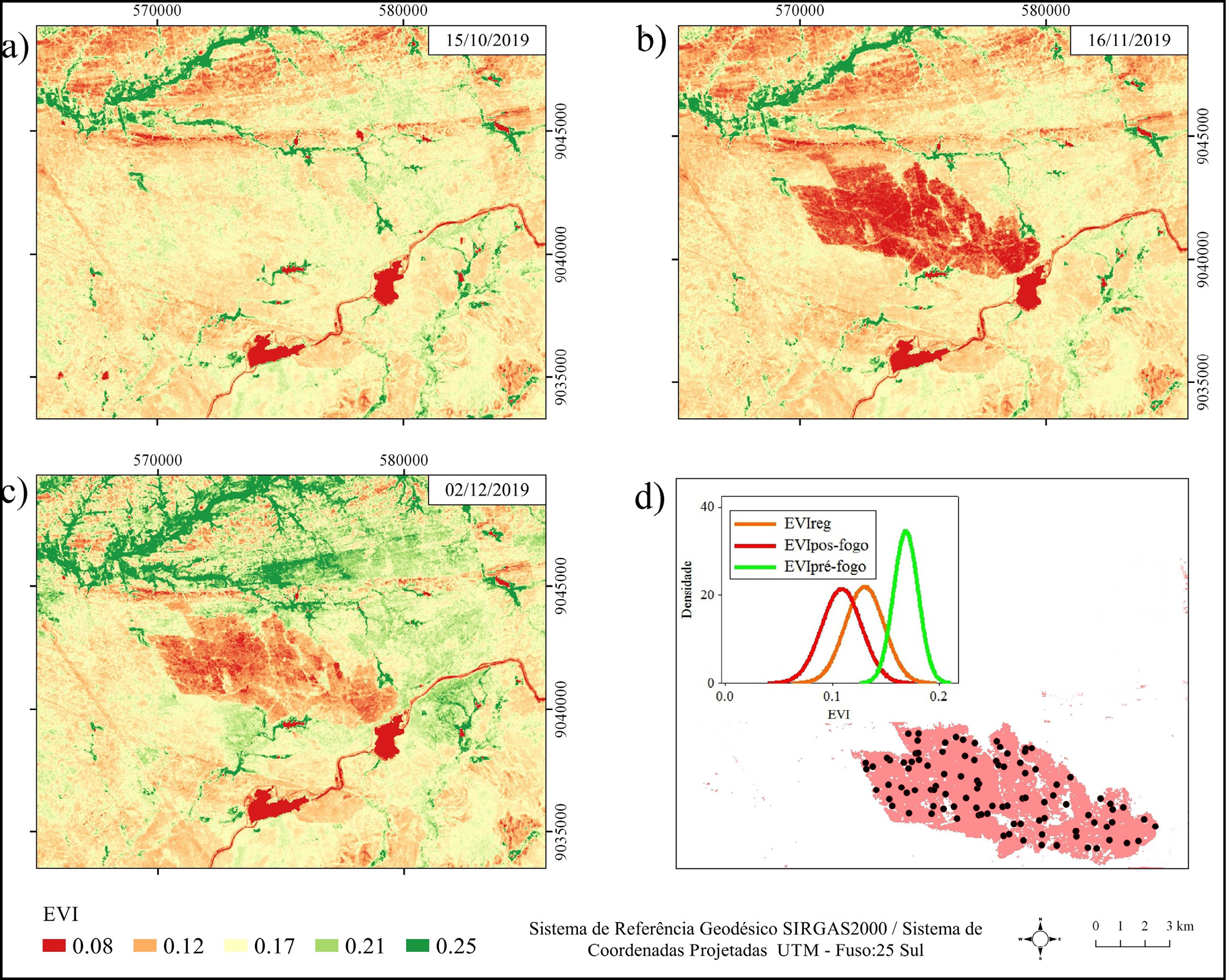 A Figura 4 apresenta plotagem de amostras de pixels de EVI testadas para os três eventos: Pré-fogo, Pós-fogo e regeneração