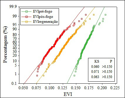 Os resultados do teste de normalidade são apresentados no gráfico da Figura 3, que indica uma boa concordância estatística sobre a normalidade da distribuição de dados de EVI para os três eventos em análise, mostrando, assim, maior probabilidade de os dados seguir uma distribuição gaussiana. Ou seja, a maioria dos dados do EVI ajustam-se a uma distribuição normal. Ressalta-se que a aquisição das amostras não foi obtida por acaso e que o conjunto amostral foi capaz de predizer todos os dados com nível de confiança de 95%.