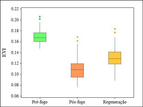 Observando-se a Figura 4 é possível verificar que antes do evento de incêndio as amostras de EVI apresentaram maior mediana e menor intervalo interquartil, evidenciando assim a homogeneidade de pixels de EVI, isto é, sem alterações importantes na cobertura vegetal. O EVIpós-fogo apresentou menor mediana da série provavelmente devido à perda da vegetação natural causada pelo incêndio. O EVIreg apresentou um aumento no valor da mediana, mostrando assim um bom desempenho da vegetação no processo de regeneração do bioma após aproximadamente 16 dias do incêndio. Apesar de todas as variáveis apresentarem outliers, apenas o EVIpós-fogo e EVIreg apresentaram desvio padrão e intervalo interquartil semelhantes, mostrando assim que os pixels estão com maior variabilidade nos valores de EVI.