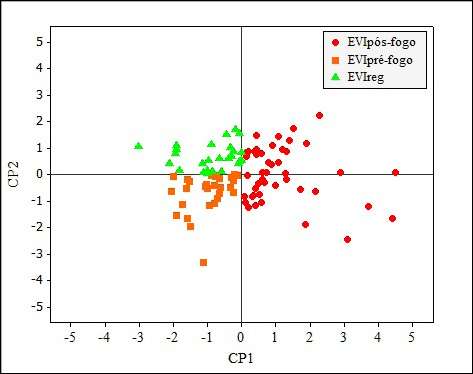 A CP1 apresentou valores de coeficientes positivos com maiores contribuições para as variáveis EVIpós-fogo e EVIreg. A CP2 apresentou baixos valores de coeficientes. É importante destacar o coeficiente negativo para a variável EVIpré-fogo. Dessa forma, a CP1 pode ser chamada de componente de áreas afetadas pelo incêndio,uma vez que as variáveis EVIpós-fogo e EVIreg se destacam neste componente de acordo com os coeficientes de ponderação e também de correlação contidos na Tabela 2. A CP2, pelo contraste presente entre a variável EVIpré-fogo observada na equação e na Tabela 2, pode ser chamada de componente de áreas não incendiadas.