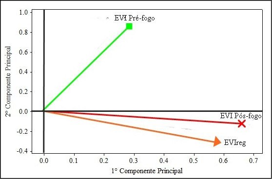 A segunda componente principal mostra o contraste nos sinais no EVIpré-fogo e baixos valores dos coeficientes EVIpós-fogo e EVIreg, assim, este componente mede principalmente a variabilidade do deslocamento da variável EVIpré-fogo antes do incêndio ao longo da CP1. Demostrando a variação dos dados de forma decrescente e independente. A Figura 8 também mostra a disparidade das equações no plano. Dessa forma, a multiplicidade dimensional dos dados é condensada a um espaço bidimensional, garantindo máxima mudança e reforçando as diferenças nas séries temporais. A Figura 8 mostra a disposição dos eixos das variáveis EVIpré-fogo, EVIpós-fogo e EVIreg, o espaço bidimensional da CP1 e CP2 num gráfico biplot.