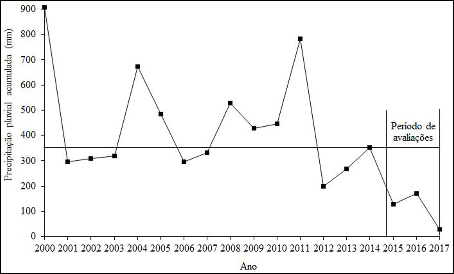 Pelos dados do acumulado da precipitação pluviométrica média anual no município de Boa Vista – PB, do mês de janeiro do ano de 2000 até abril de 2017 (AGÊNCIA EXECUTIVA DE GESTÃO DAS ÁGUAS, 2017) verificou-se que os picos de precipitação acumulados ocorreram em 2000 (906,7 mm), 2004 (673,1 mm), 2008 (527,1 mm) e 2011 (781,9 mm) (Figura 1). A variação pluviométrica observada durante o período exposto reforça a irregularidade de chuvas na área semiárida da Caatinga. No período compreendido no estudo fenológico de Sideroxylon obtusifolium, outubro de 2014 até fevereiro de 2017, a ocorrência de chuvas foi reduzida em comparação aos anos anteriores.