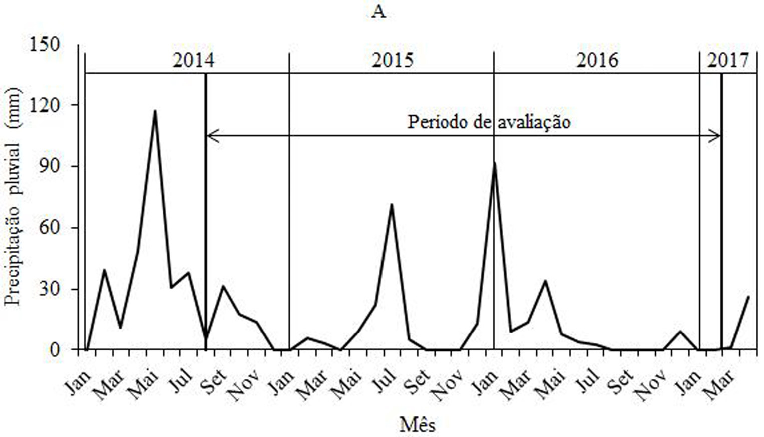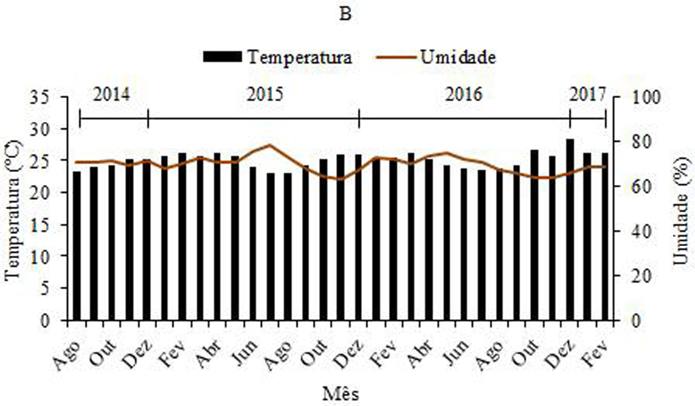 Nos anos de 2014 e 2015, a intensificação das chuvas foi de maio a julho (estação chuvosa), enquanto em 2016 o pico de precipitação ocorreu no mês de janeiro, sendo escassa até fevereiro de 2017. No primeiro ano de avaliação (agosto de 2014 a julho de 2015), foi registrado um acumulado de precipitação pluvial de 185 mm e, no segundo (agosto de 2015 a julho de 2016), de 180 mm (Figura 2A). Na Figura 2B, constam a temperatura média e a umidade relativa do ar durante o período de observação fenológica. As temperaturas mais amenas foram registradas nos meses de maio a agosto dos anos 2015 e 2016, período no qual também ocorreram os maiores valores para a umidade relativa do ar.