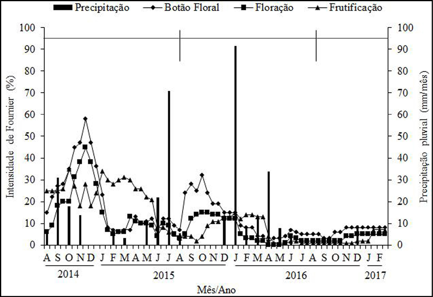 De agosto a dezembro de 2015, a frutificação acompanhou a emissão de botão floral e flores, estendendo-se de janeiro a junho de 2016, mesmo com a diminuição da intensidade da fase de botão floral e floração. No segundo ano, a presença de botão floral foi mais intensa de setembro de 2015 a janeiro de 2016, com pico em outubro de 2015 (32%), porém muito inferior ao registrado em novembro de 2014 (58%), enquanto no intervalo entre agosto de 2016 e fevereiro de 2017 o comportamento da frutificação foi distinto dos anos anteriores (Figura 4).