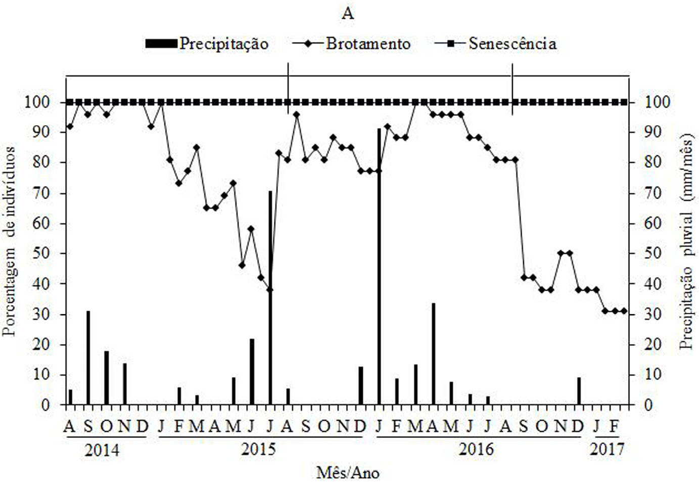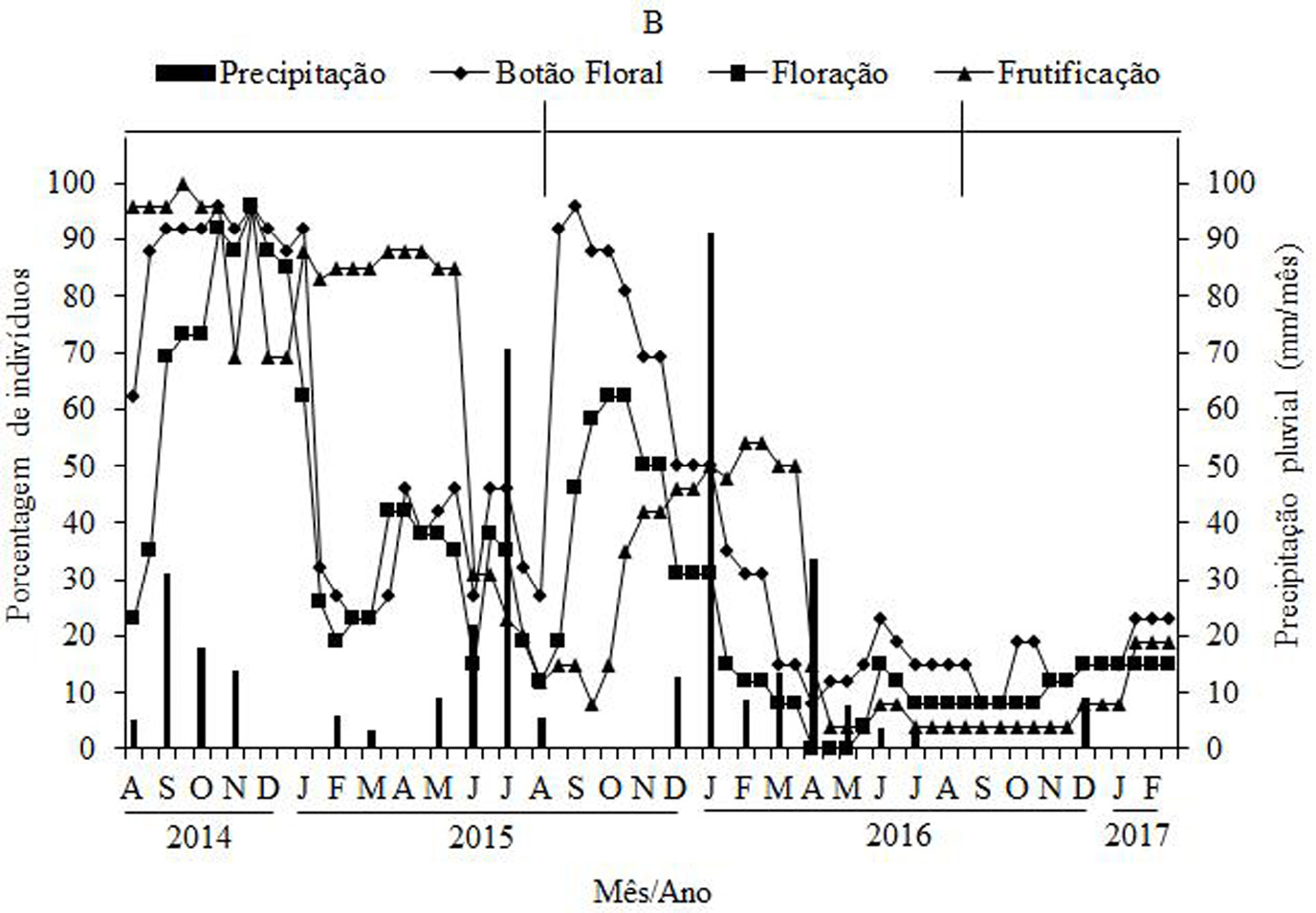 Figura 5 – Porcentagem de indivíduos de Sideroxylon obtusifolium nas fenofases de brotamento e senescência (A), botão floral, floração e frutificação (B), registradas quinzenalmente e precipitação pluvial mensal no período de agosto de 2014 a fevereiro de 2017, no município de Boa Vista – PB