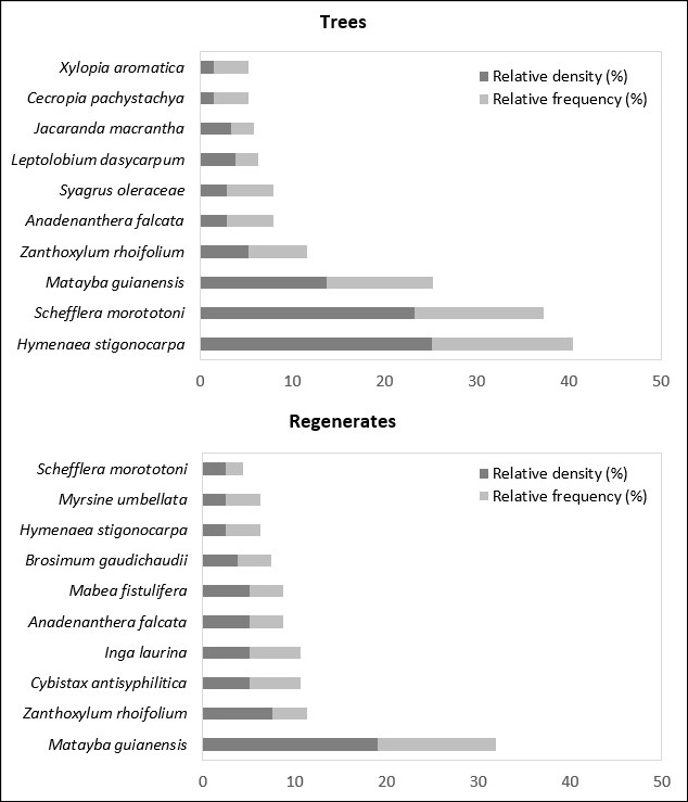 Figure 1 – Relative values of density and frequency of the 10 main species in number of individuals for each stratum in the urban fragment of semideciduous forest, Jataí, Goiás state