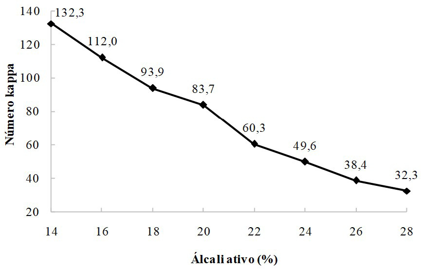 Nas condições utilizadas no estudo a carga de álcali ativo de 18% foi a que apresentou o maior rendimento depurado, com 52,6%, número kappa de 93,9, teor de rejeitos de 4,3%, com o menor consumo específico de madeira (6,0 m³ tsa-1).