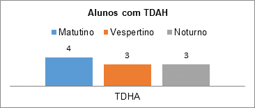 No próximo gráfico será exposto o quantitativo de alunos com Transtorno do Déficit de Atenção e Hiperatividade. Esses alunos não são reconhecidos como público alvo da educação especial, todavia requerem um olhar diferenciado no processo de ensino aprendizagem. O gráfico 3 representa a quantidade de alunos com TDHA, matriculados na escola em questão.