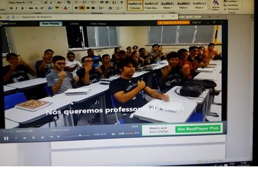 Em 2019, compartilhamos em um grupo de surdos, sobre política, um vídeo feito por uma professora e sua turma de alunos surdos, que foi veiculado no Jornal Nacional, pela rede Globo de televisão, como parte da campanha lançada pela emissora com o tema “O Brasil que eu quero” (Figura 5).