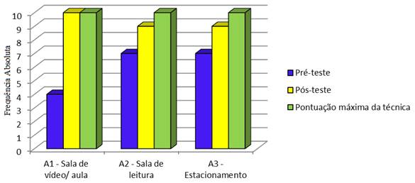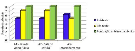 No estacionamento (A3), foi observado que a estudante teve um decréscimo na pontuação, pois, deixou de realizar os comportamentos de manter um ritmo constante de passada e de locomover-se em linha reta. Decréscimo este que pode ter sido pelo fato de, no momento da avaliação pós-teste, algumas salas terem sido liberadas, permitindo que os estudantes ficassem nos ambientes externos da escola (pátio, refeitório, etc.). Nesse caso, o barulho pode ter feito com que escutar e identificar a localização do som se tornassem tarefas difíceis de serem executadas. Apesar de a pesquisa ter sido delineada para o treinamento ocorrer em situações fora dos momentos do intervalo, alguns professores liberaram os alunos bem antes do horário estabelecido. Numa pesquisa realizada em ambiente natural, nem sempre é possível controlar variáveis externas ou intervenientes (COZBY, 2003).
