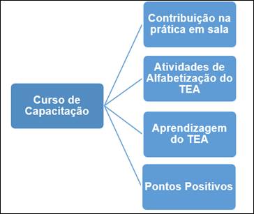 No que se refere ao Curso de Capacitação de Professores, na Figura 1, é elencada a categoria com as unidades contribuição na prática em sala de aula, atividades de alfabetização do TEA, aprendizagem do TEA e, por fim, os pontos positivos que o Curso de Capacitação de Professores trouxe para a prática dos profissionais da área da educação Especial e Básica com os alunos com Transtorno do Espectro Autista.