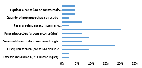 Quanto à dificuldade de inserir o aluno surdo no ensino tecnológico, 20% responderam ter pouca dificuldade, enquanto os demais citaram diversos entraves, destacando principalmente a dificuldade de comunicação, pois poucos docentes dominam a Libras e, mesmo com intérpretes, é muito importante ter um envolvimento comunicacional mínimo com o aluno. Além disso, não há formação docente inicial no IFS em língua de sinais, o que dificulta também o entendimento do processo de interpretação/tradução por grande parte do corpo docente.