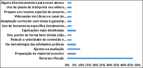 Em relação às adaptações de provas, um percentual de 60% afirma que o fez apenas em momentos de avaliação, utilizando provas em Libras (oral com apoio do intérprete), recursos visuais, material concreto, questões objetivas e apresentação de atividade prática.