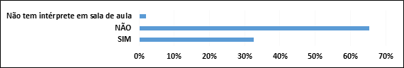 Em relação ao envio antecipado dos conteúdos a ser ministrados percebemos que 65% não fizeram envio do material da aula com antecedência para os intérpretes se prepararem. A falta de planejamento e integração entre docente e intérprete dificulta aos alunos a acompanharem o conteúdo, pois o intérprete não possui formação específica nas diversas áreas de conhecimento em que atua e, justamente por esse motivo, necessita estudar os termos técnicos de cada disciplina, para traduzi-los adequadamente ao alunado.