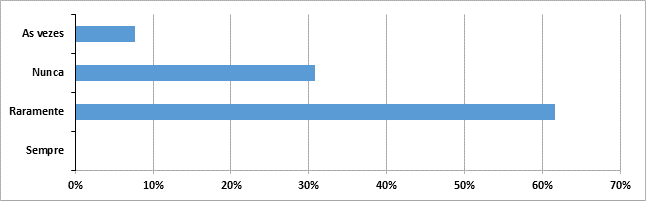 Outro ponto de estrangulamento do processo é a falta de envio de material das aulas com antecedência por 100% dos professores. Desse total, cerca de 60% envia raramente, conforme o gráfico acima. O envio antecipado é fundamental para que o intérprete se aproprie do assunto, estude os sinais mais adequados para fazer uma tradução equivalente aos conceitos trabalhados em língua portuguesa.