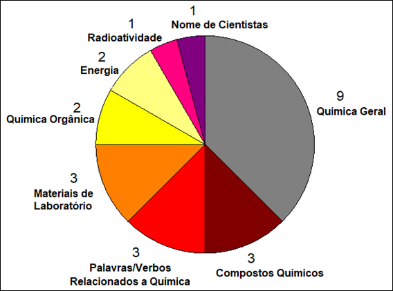 Já em relação à subcategoria ‘Palavras/Verbos Relacionados a Química’ trouxe palavras e verbos do vocabulário comum que também são utilizados no contexto químico, como exemplo: modificar, experiência, representação, pesquisar. Assim, encontrou-se 46 palavras e 47 sinais-termo e a pesquisa que trouxe mais contribuições para essa subcategoria foi Costa (2014).