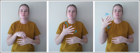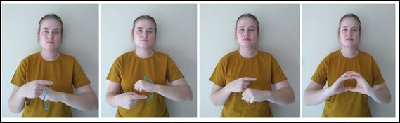 Tomamos como exemplo a palavra elemento químico que aparece nas pesquisas de Reis (2015), Pontara (2017), Pereira (2017), Carvalho (2017), porém, 3 sinais-termo diferentes foram identificados, ou seja, duas pesquisas (Reis (2015) e Pontara (2017)) utilizaram o mesmo exemplo de sinalização para essa palavra. Nas Figuras 10, 11 e 12 podemos notar que os sinais-termo possuem o modo de sinalizar bem diferente, o que pode confundir os TILS e alunos que busquem por essa sinalização.