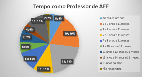 Os participantes são 94% professoras e 6% professores com a seguinte distribuição de faixa etária: 1% entre 18 e 27 anos, 15% de 28 a 37 anos, 49% de 38 a 47 anos, 27% de 48 a 57 anos e 8% com mais de 57 anos. Os respondentes atuavam nos seguintes estados do Brasil, 54% em São Paulo, 30% no Amazonas, 7% na Bahia, 7% no Ceará, 1% no Maranhão e 1% em Minas Gerais, distribuídos por diversos municípios. Todos os questionários foram analisados e dentre os respondidos não houve representação dos demais estados. O Gráfico 1 demonstra o tempo de exercício profissional na função de professor do AEE.