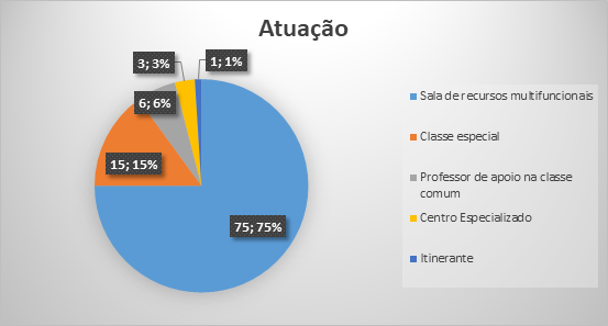 Esta distribuição demonstra conformidade com a legislação educacional, com a maioria dos professores do AEE atuando em Salas de Recursos Multifuncionais. Porém, cabe destacar o número ainda expressivo de classes especiais revelando a necessidade de aumentar o fomento às ações inclusivas, como, por exemplo, a implementação de sala de recursos e pesquisas na perspectiva educacional inclusiva.