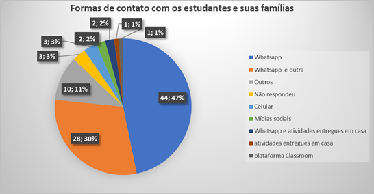Uma porcentagem expressiva (44,4%) associou o contato pelo WhatsApp a outra plataforma on-line (como o Meet, Google Classroom, Zoom, , bem como telefonemas e e-mails). Em menor número, apontaram: WhatsApp mais atividades entregues em casa. Ou respostas mais genéricas como uso do celular, sem especificar se foram ligações, vídeochamadas etc.