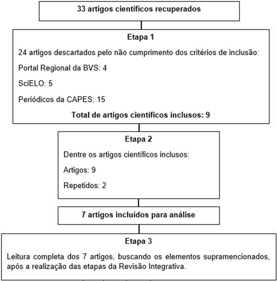 Após a coleta de dados nas bases de dados, a análise do material selecionado obedeceu às seguintes etapas: 1) leitura dos títulos e resumos dos artigos, para verificar se atendiam aos critérios de inclusão referidos; 2) eliminação dos artigos duplicados; 3) leitura completa dos artigos que cumpriram os requisitos da etapa anterior.