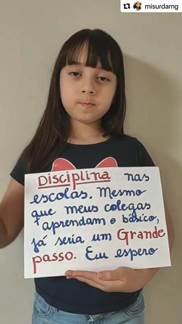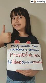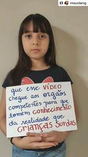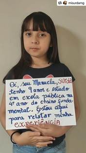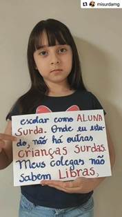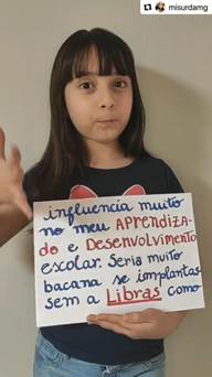 A menina que aparece no vídeo chama-se Manuela, tem uma irmã que também é surda, filha de mãe surda e avós surdos. No Youtube6 e no Instagram, além da publicação intitulada “Queremos Libras como disciplina obrigatória nas escolas” (foco deste estudo), a mãe das meninas posta diariamente vários vídeos na sua página retratando a realidade que suas filhas vivenciam por serem surdas. As figuras abaixo elucidam a intencionalidade do vídeo realizado.