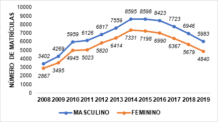 Figura 2 – Matrículas de estudantes com deficiência intelectual, segundo sexo, na EJA Especial em Minas Gerais (2008-2019)