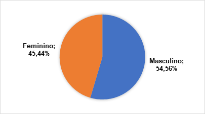 A análise da Figura 3 constata que as matrículas de estudantes com DI do sexo masculino, na EJA Especial, são superiores em relação às matrículas do sexo feminino, representando 54,56% (masculino) e 45,44% (feminino), no período entre 2008 e 2019.