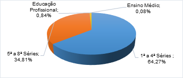 Os dados da Figura 5 demonstram que as matrículas de estudantes com deficiência intelectual na EJA Especial estão concentradas na 1ª a 4ª séries. O percentual de matrículas nesta Etapa de Ensino (anos iniciais do Ensino Fundamental) destacou-se em comparação às demais Etapas - o que corresponde a 64,27%, seguida da 5ª a 8ª séries (34,81%), Educação Profissional (0,84%) e Ensino Médio (0,08%).