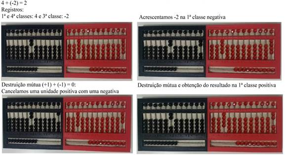 Para realizar adições no Soroban dos Inteiros envolvendo quantidades de diferentes naturezas, acrescentamos as quantidades positivas ou negativas na primeira classe, entretanto, para obter o resultado utilizamos o princípio de equivalência para cancelar unidade positiva com negativa, num processo de destruição mútua, até esvaziar uma das primeiras classes. Este processo, permite a percepção de que adicionar um número negativo equivale a subtrair seu valor em módulo, conforme ilustrado na figura 14, na resolução de 4 + (-2) = 2, quando registramos 4 e por fim, deste número, retiramos 2.