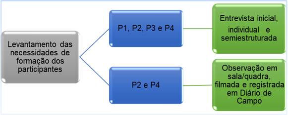Esta fase busca responder o primeiro objetivo específico. Nela, levantamos as necessidades de formação dos participantes por meio de entrevistas individuais e observações nas salas de aula de P2 e P4.