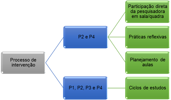 Baseamo-nos nas reflexões emergidas, nas sessões reflexivas e nos ciclos de estudos foram planejadas intervenções em sala de aula pelos professores participantes em colaboração com a pesquisadora. Foi realizada uma sessão de planejamento de aulas com P2 e duas com P4.