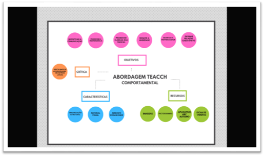 A dupla (P8 e M11) apresentou o mapa mental sobre o TEACCH. As estratégias e recursos pedagógicos demonstrados pela dupla foram pertinentes para a aprendizagem escolar e evidenciaram uma compreensão acertada quanto à abordagem. Sugeriram ambientes organizados e ensino estruturado; instruções visuais fortemente presentes; rotina e atividades individualizadas bem definidas; previsibilidade nas atividades por ordem cronológica para reduzir a ansiedade; ampliação do repertório comunicativo por meio de cartões para Comunicação Alternativa ou Ampliada (CAA) e a possibilidade de utilização do aplicativo educativo ABC Autismo.