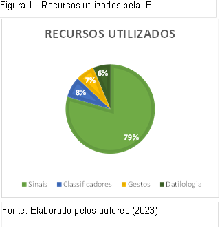 Em suma, verifica-se um equilíbrio, que pode ser intencional ou não, no uso de classificadores, gestos e do alfabeto manual, percebido no gráfico da Figura 1. Em contrapartida, há uma diferença considerável entre a frequência de uso desses recursos em comparação aos sinais. Entendemos que essa diferença é natural pois os mesmos, assim como as palavras no Português, irão estruturar o discurso, marcando os sujeitos, o contexto que o cerca ou a ação no qual está envolvido, trazendo coesão e coerência à sinalização.