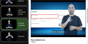 Ao longo do processo, como recurso de compreensão da informação e interação com o Portal do Candidato, a participante comparava a informação no tutorial com a informação solicitada no portal, buscava as caixas marcadas em vermelho nas imagens de fundo nos vídeos, que sinalizavam o que deveria ser preenchido no portal, a tradução na janela de Libras e as legendas em português do que estava sendo sinalizado em Libras e digitava a informação solicitada (Figura 3). Sempre que necessário, a participante voltava ao tutorial, para verificar se a compreensão da informação estava correta para, então, digitar a informação solicitada no portal. O processo de inscrição no Portal do Candidato com o apoio do tutorial demandou 25 minutos para ser finalizado com êxito e conduziu a participante a selecionar a Ação Afirmativa correspondente ao seu perfil: Escola pública, PcD, independente de renda (Figura 4):
